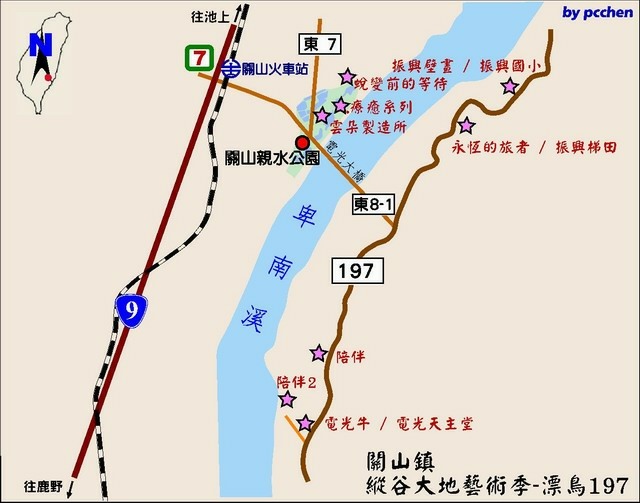最後才來走訪關山鎮的8個作品,行車方向由南往北,走縱谷公路台9線進關山市區前,右轉[東8-1]鄉鎮道,過電光大橋於接上[縣道197]後右轉,行車不久道路右側稻田中可以看到作品「陪伴」。