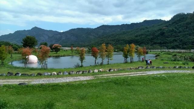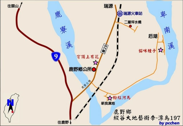 我們的行程:第一天先走訪鹿野鄉的6個作品,行車方向由南往北,走縱谷公路[台9線]出鹿野市區後不遠,切入[東29]鄉鎮道,過鹿寮大橋後右側有小路通往新良濕地,可見到作品1「蝴蝶來了」。