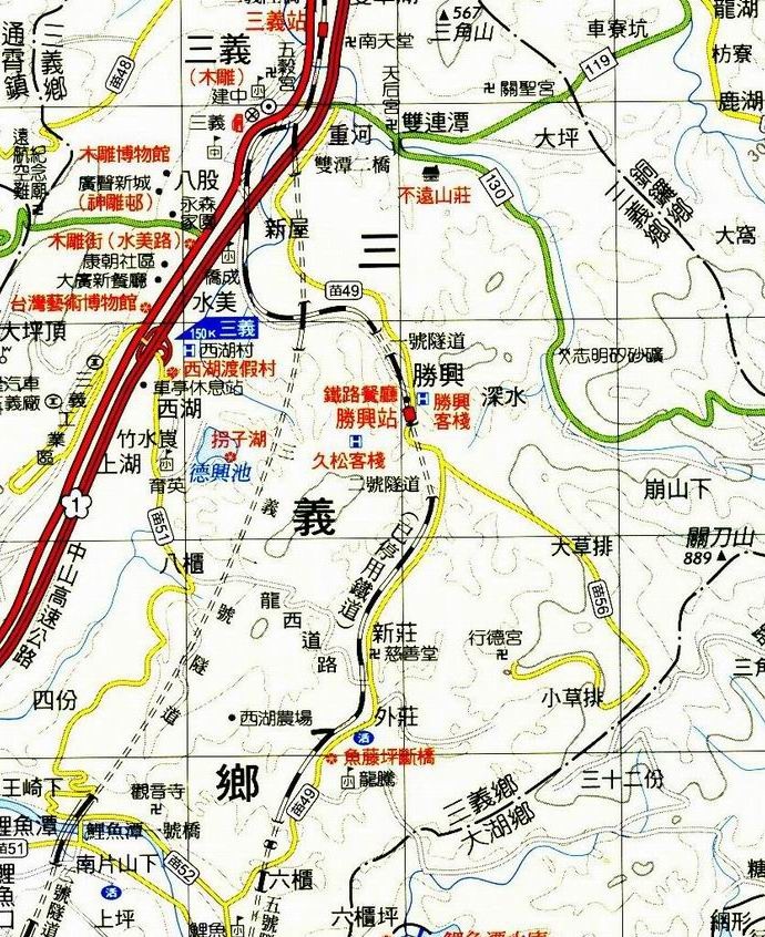 位於苗栗三義被譽為「台灣鐵路藝術極品」的龍騰斷橋(原名魚藤坪斷橋)建於1905年左右,橫跨於龍騰溪谷上氣勢萬千。可惜於1935年4月21日的關刀山大地震中嚴重損毀,1999年9月21日再度遭受九二一大地震的無情摧殘,第六支橋墩又斷了一節,斷橋除了深具古樸之美,也算是經歷了二次大地震的活見證(見龍騰斷橋史蹟簡介)。如今還可看到北端的六個以及南端的四個橋墩遺蹟,紅色斑駁的磚造斷橋遺蹟,是鐵道攝影的最佳景點,三義鄉公所也積極爭取古蹟保存。目前與勝興車站並列為舊山線二大熱門旅遊景點(見地圖)。